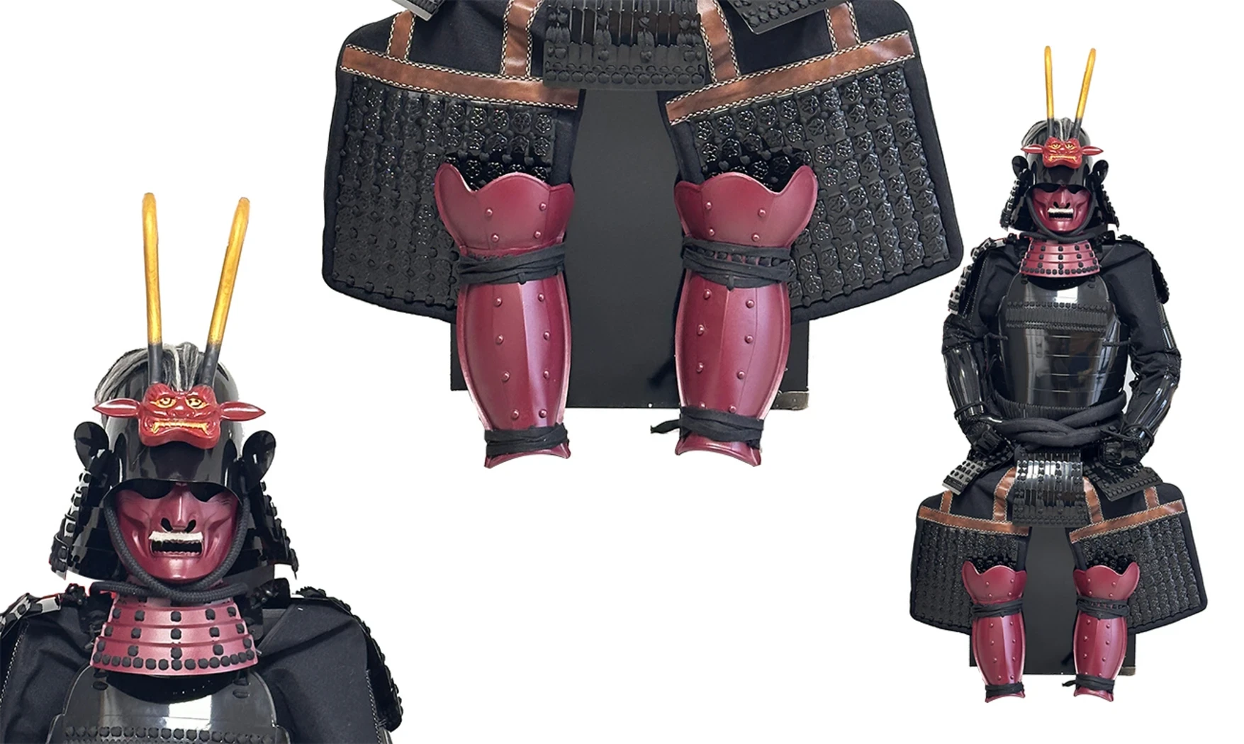 Chaque élément de l’armure est fabriqué à la main par des artisans spécialisés, perpétuant les techniques traditionnelles du Yoroi. Les plaques sont assemblées individuellement et reliées par un laçage précis qui assure à la fois mobilité, solidité et authenticité historique. Le masque mempo rouge mat, associé à des protège-tibias assortis, renforce l’aura guerrière de l’ensemble et rappelle l’objectif premier de ces équipements : intimider l’ennemi avant même le premier coup.